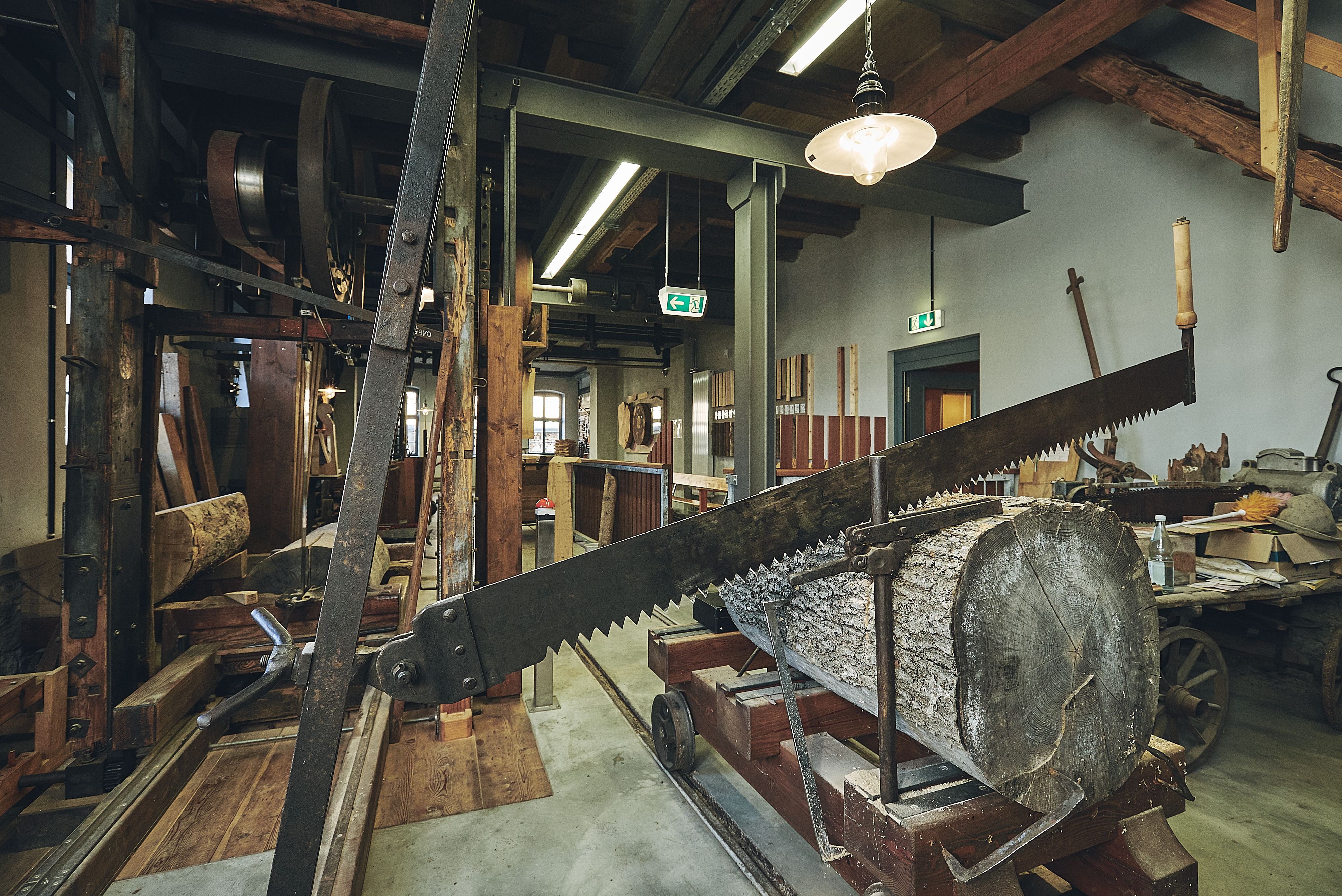 Erleben Sie hautnah mit, wie ein Riesenfuchsschwanz ein Meter starke Baumstämme zerteilt, wie eine Trenngattersäge das Holz viertelt und am Ende der Sägestrecke millimeterschwaches Furnierholz geschnitten wird. Fühlen Sie sich hineingestellt in die Arbeitsbedingungen unseren Vorfahren, bewundern Sie mit uns die Antriebsweise der Sägestrecke, denn über eine zentrale Kraftmaschine arbeitet jede Säge über Wellen, Scheiben und Riemen.