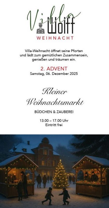 Zum ersten Mal öffnet die Villa Wolff Ihre Tore zur Villa Weihnacht - und lädt Euch ein zu einem ganz besonderen, gemütlichen Weihnachtsmarkt voller Herz und Lichterglanz.