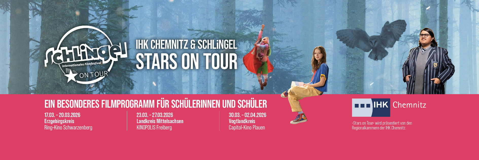 Auch in diesem Jahr 2026 kooperiert die IHK Chemnitz und ihre Regionalkammern mit dem SCHLINGEL-Filmfestival und verbindet Kino und Berufsorientierung. Unterstützt von engagierten regionalen Unternehmen können sich Schüler jeder Klassenstufe auf außergewöhnliche Geschichten und inspirierende Filme freuen.